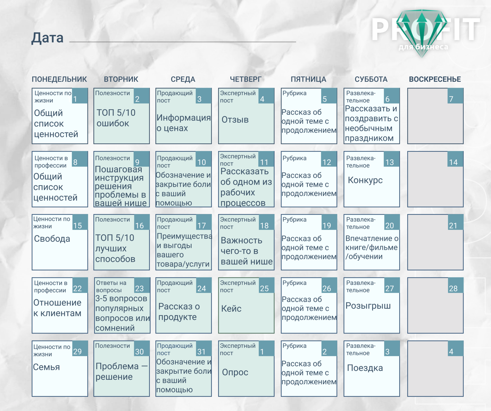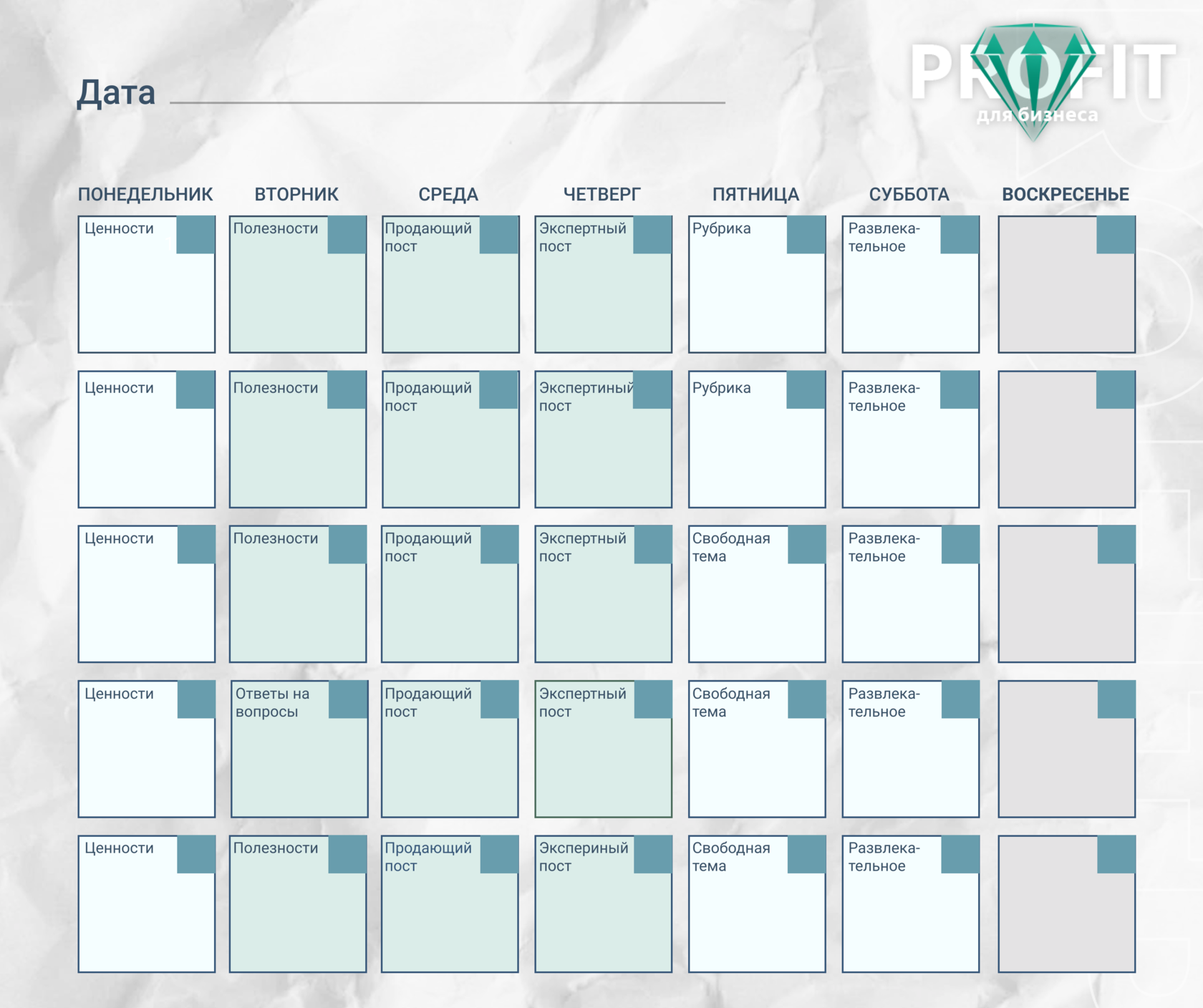 Ниже пример контента-плана и пустой и заполненный. Понедельник, пятница и суббота предназначены для более личного и развлекательно-вовлекательного. Вторник, среда, четверг - для рабочих тем. Воскресенье - выходной. Нам будет приятно, если вы им воспользуетесь)))